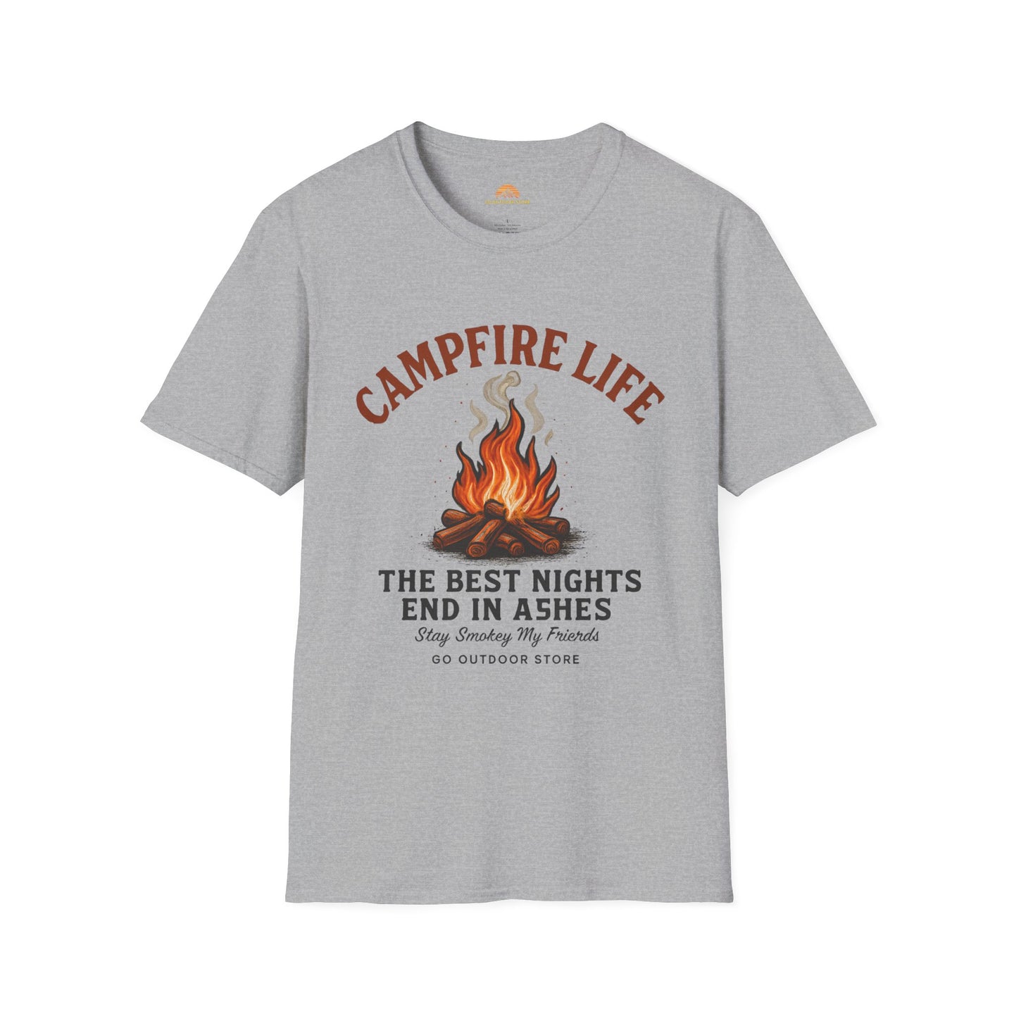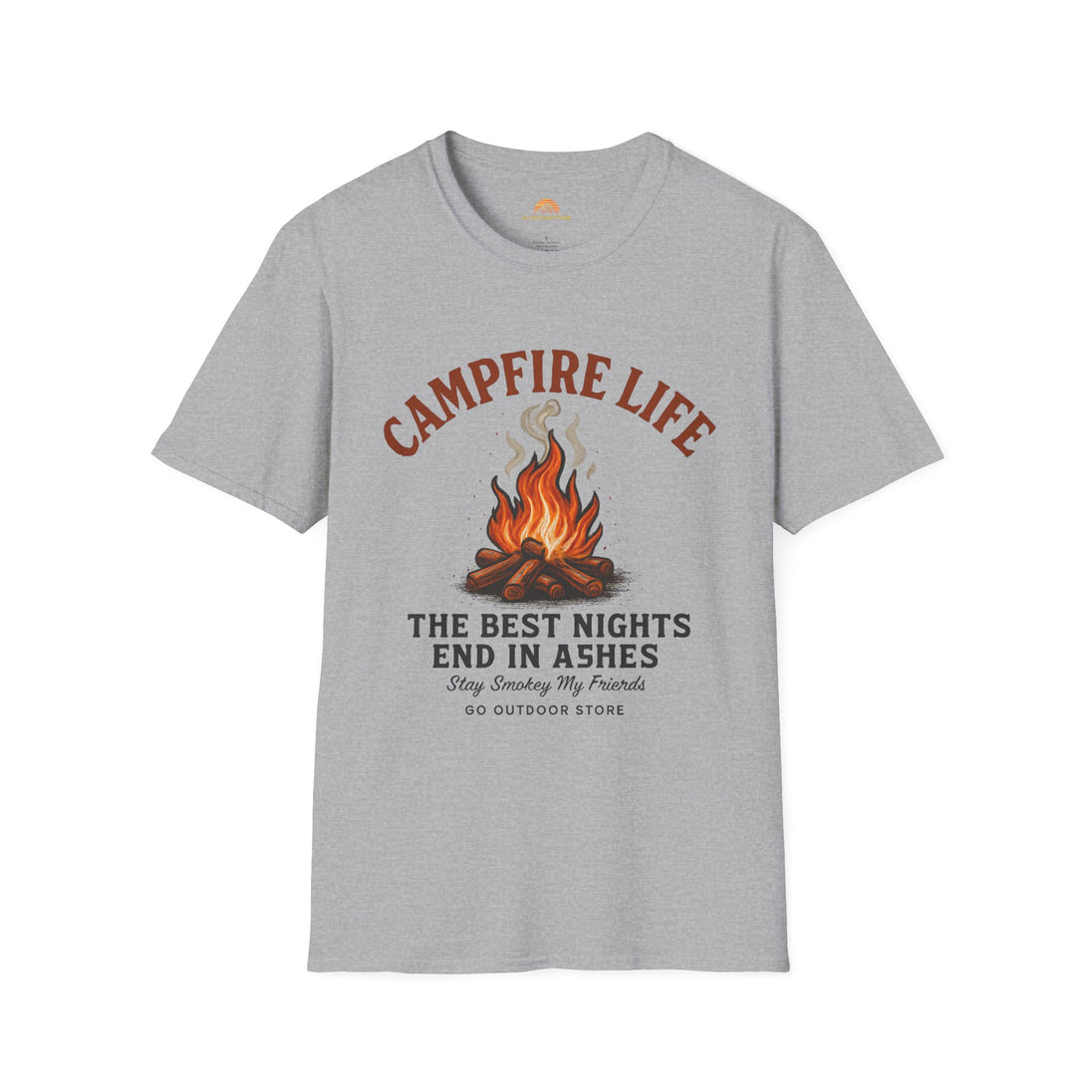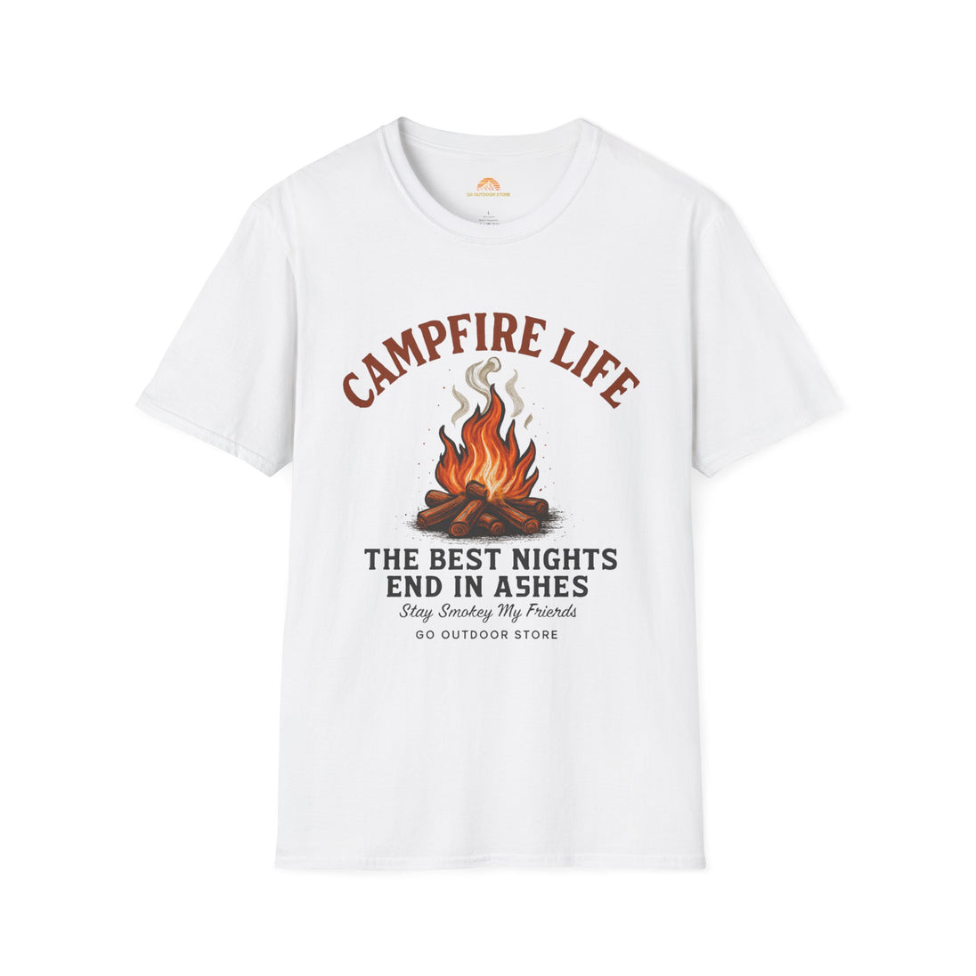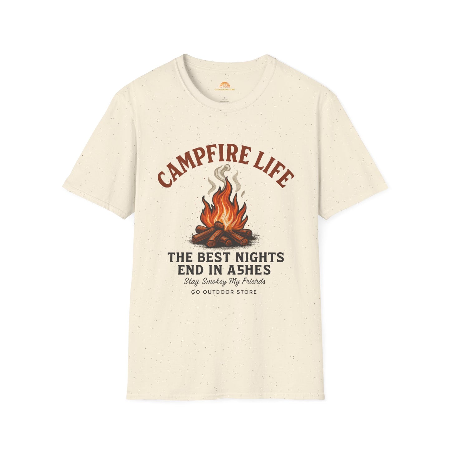 Warm, worn-in and quietly adventurous — this lightweight tee carries the smell of smoke and the hush of late-night stories. A hand-illustrated campfire sits center stage, crowned with the arching title “CAMPFIRE LIFE” and grounded by the line “The best nights end in ashes.” It reads like a memory: long evenings, folding chairs, and conversations that glow as embers die down. The soft, breathable cotton drapes easily for sitting by the fire or layering under a flannel. Subtle back artwork keeps the design interesting from every angle without shouting for attention. This shirt belongs in the pack of anyone who values slow evenings, good company, and the simple ritual of lighting a fire. Product features - Tubular knit construction reduces seams and fabric waste for a clean silhouette - Ribbed, elastic crew neck that retains shape - Twill shoulder tape prevents stretching at the back - 100% ring-spun cotton (lightweight 153 g/m²) — soft, smooth, and great for printing - Pearlized tear-away label for all-day comfort Care instructions - Do not dryclean - Do not bleach - Tumble dry: low heat - Iron, steam or dry: low heat - Machine wash: cold (max 30C or 90F), with similar colors