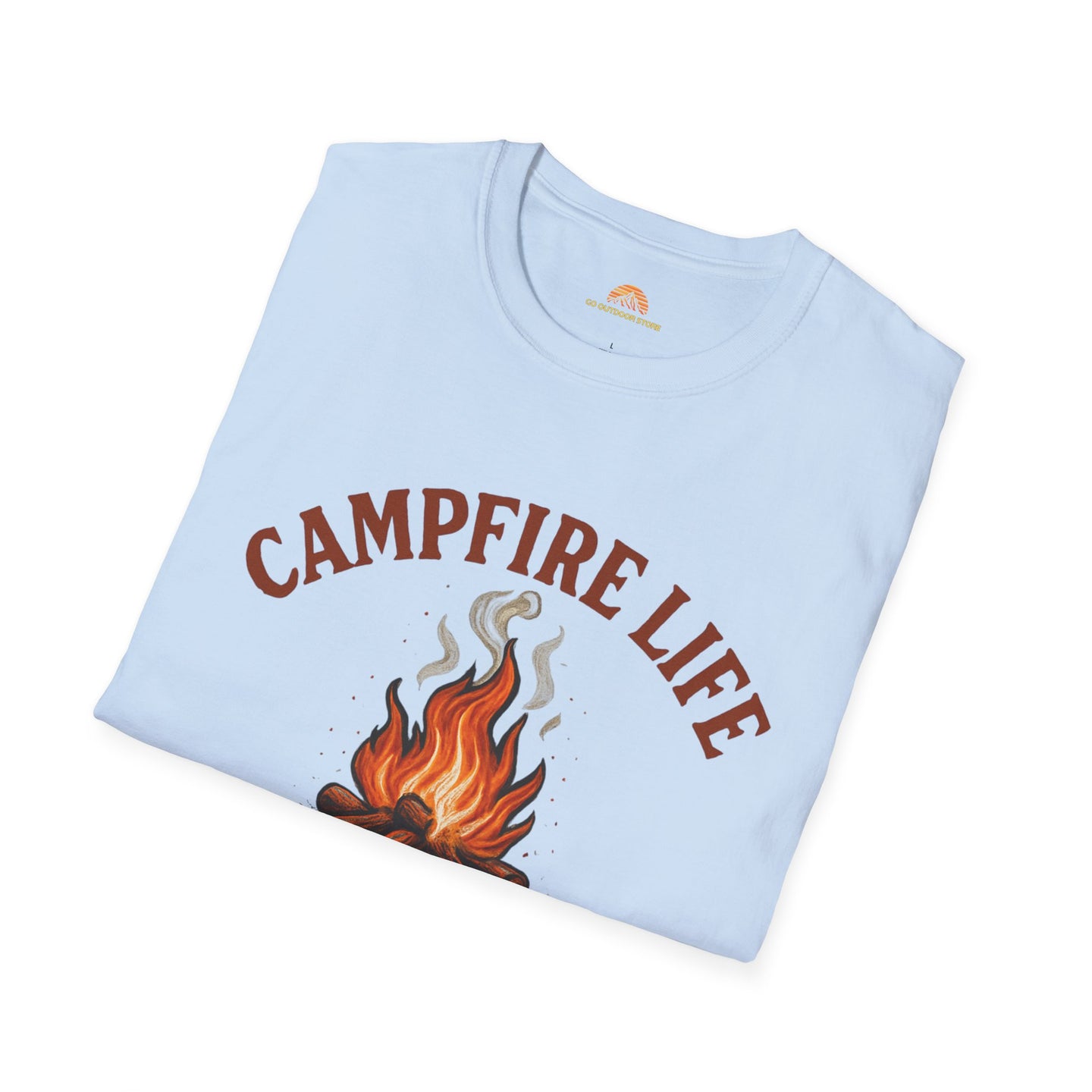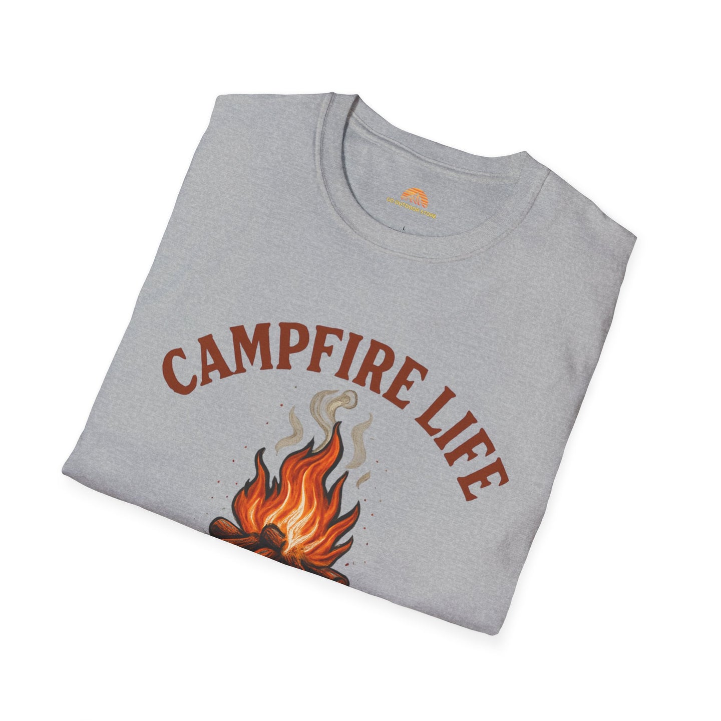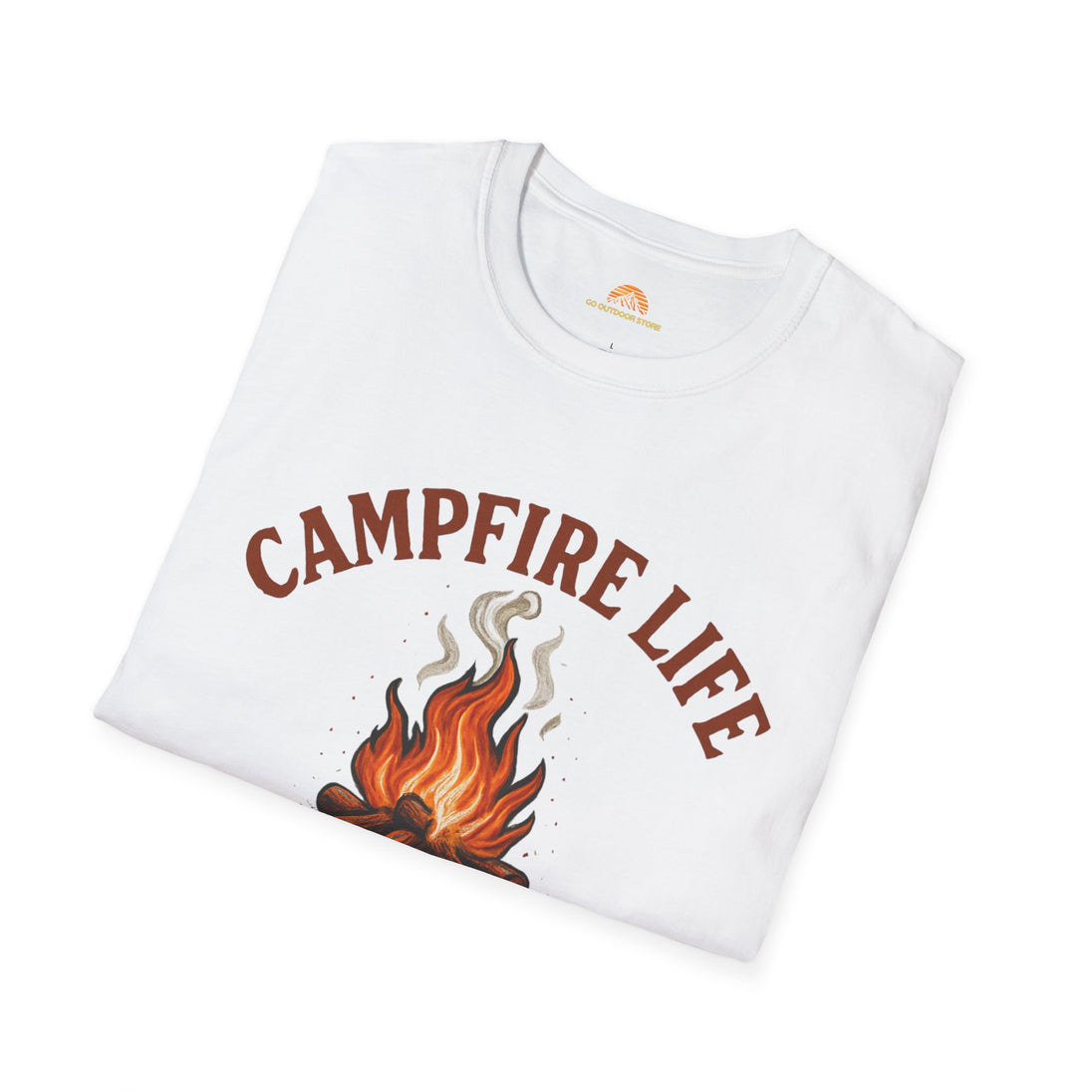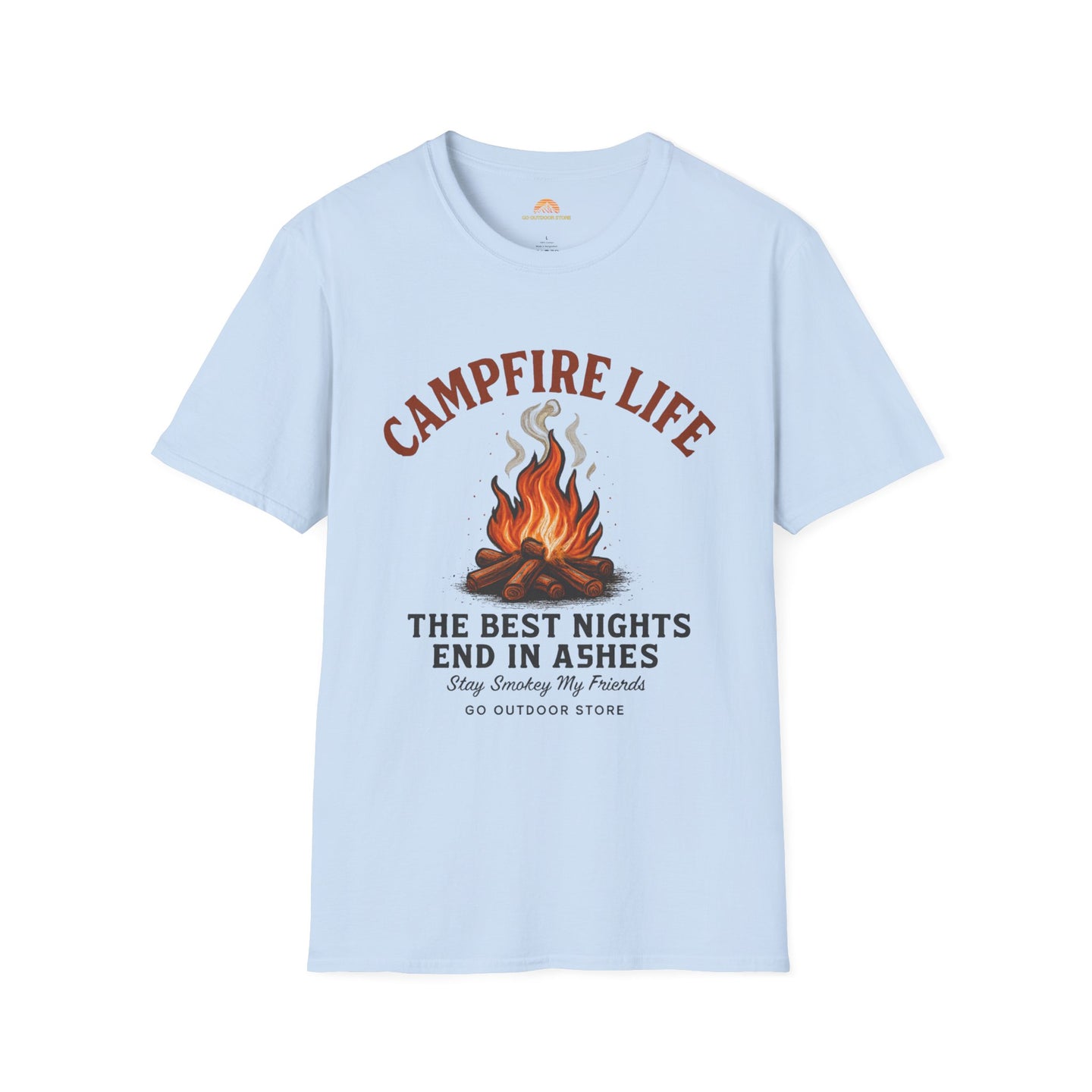 Warm, worn-in and quietly adventurous — this lightweight tee carries the smell of smoke and the hush of late-night stories. A hand-illustrated campfire sits center stage, crowned with the arching title “CAMPFIRE LIFE” and grounded by the line “The best nights end in ashes.” It reads like a memory: long evenings, folding chairs, and conversations that glow as embers die down. The soft, breathable cotton drapes easily for sitting by the fire or layering under a flannel. Subtle back artwork keeps the design interesting from every angle without shouting for attention. This shirt belongs in the pack of anyone who values slow evenings, good company, and the simple ritual of lighting a fire. Product features - Tubular knit construction reduces seams and fabric waste for a clean silhouette - Ribbed, elastic crew neck that retains shape - Twill shoulder tape prevents stretching at the back - 100% ring-spun cotton (lightweight 153 g/m²) — soft, smooth, and great for printing - Pearlized tear-away label for all-day comfort Care instructions - Do not dryclean - Do not bleach - Tumble dry: low heat - Iron, steam or dry: low heat - Machine wash: cold (max 30C or 90F), with similar colors