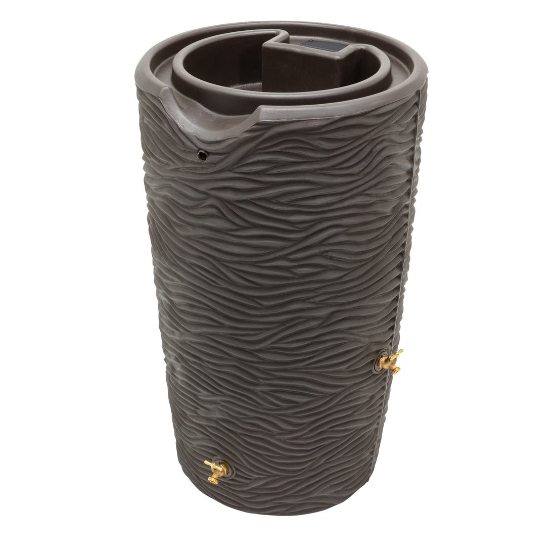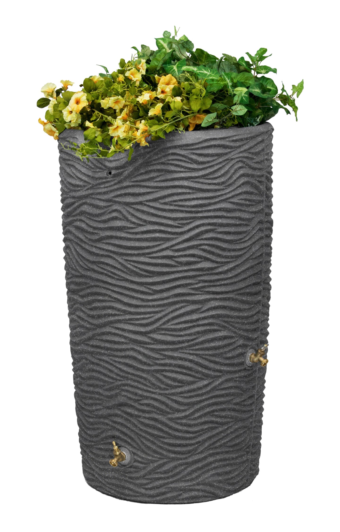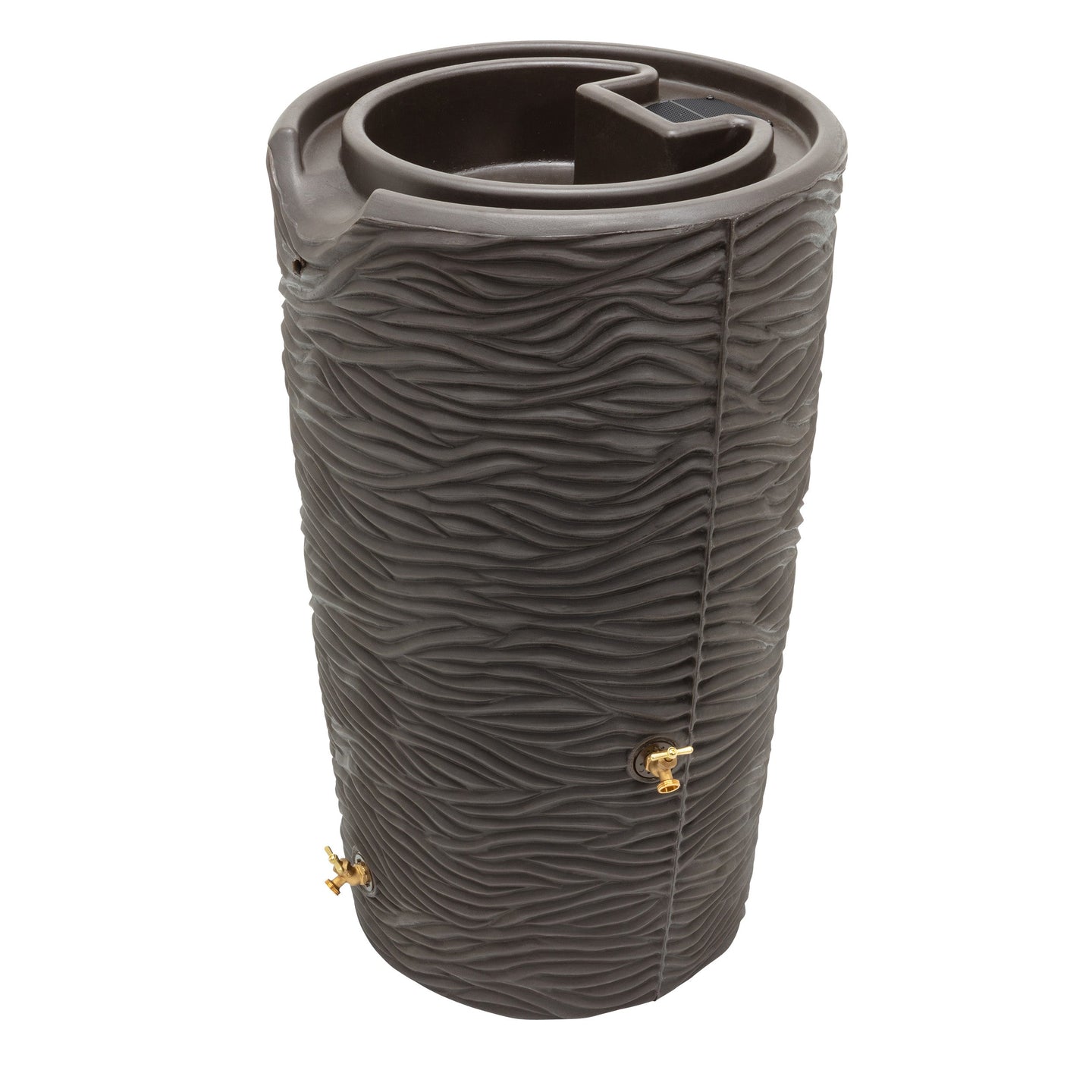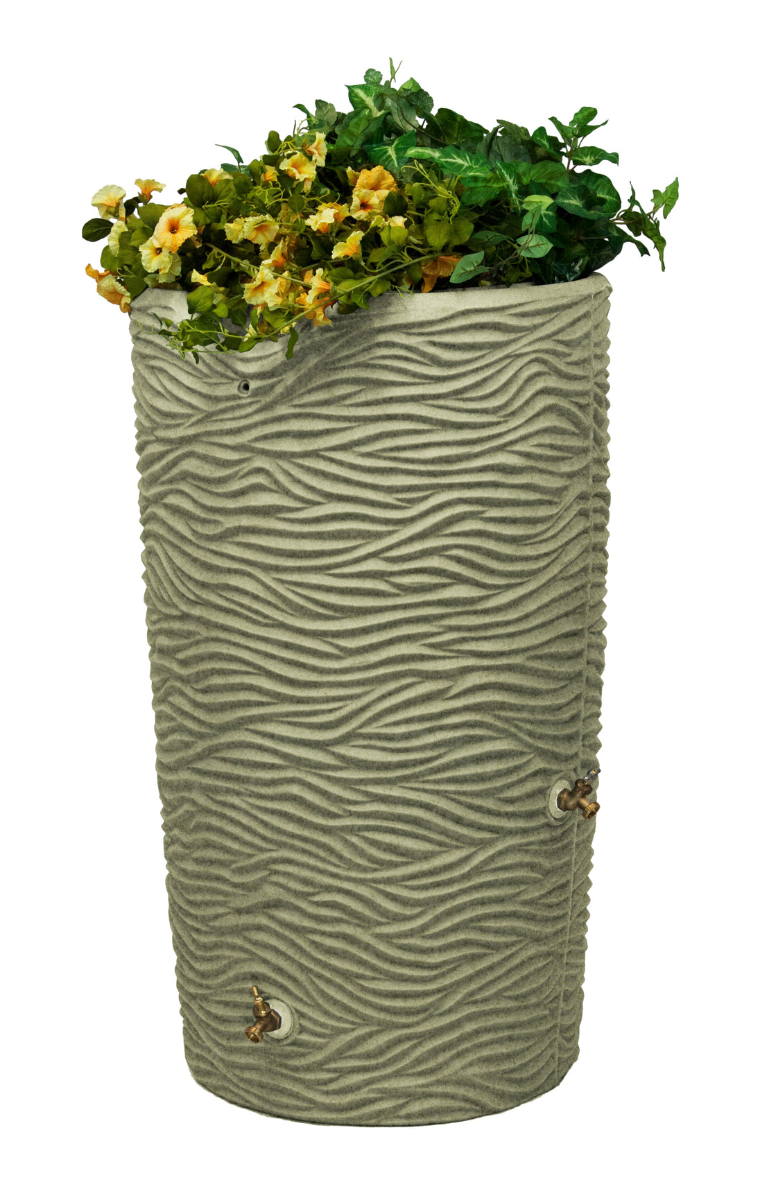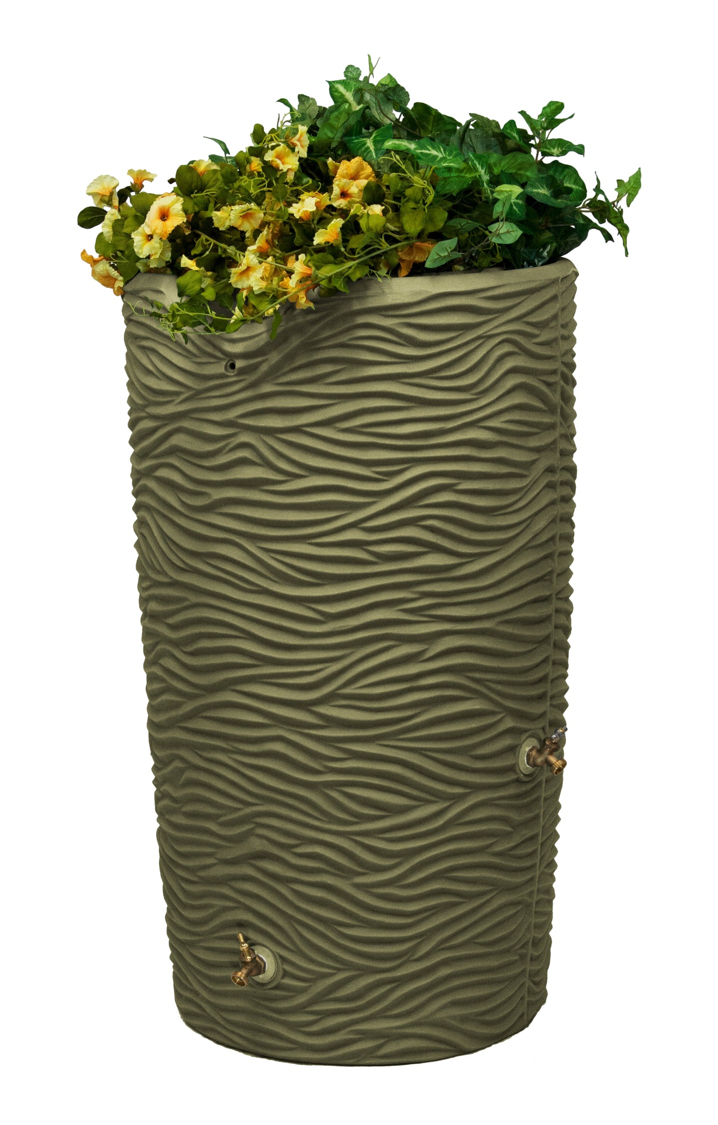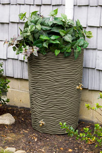The Impressions Palm 65 Gallon Rain Saver is one of the sturdiest and most eye-catching rain barrels on the market. Its appearance emulates the rough texture of a palm tree trunk, and with a deep welled top, you can plant an array of flowers or even a small herb or vegetable garden. The top also includes the Good Ideas original, integrated channel that automatically diverts overflow to the front of the barrel and keeps your foundation from flooding. The large opening can be used for 2x3 or 3x4 downspouts and is covered with a soft, fine mesh, plastic screen that keeps out heavy debris. Also included with the barrel are two sturdy brass spigots to install in the offset spigot locations.