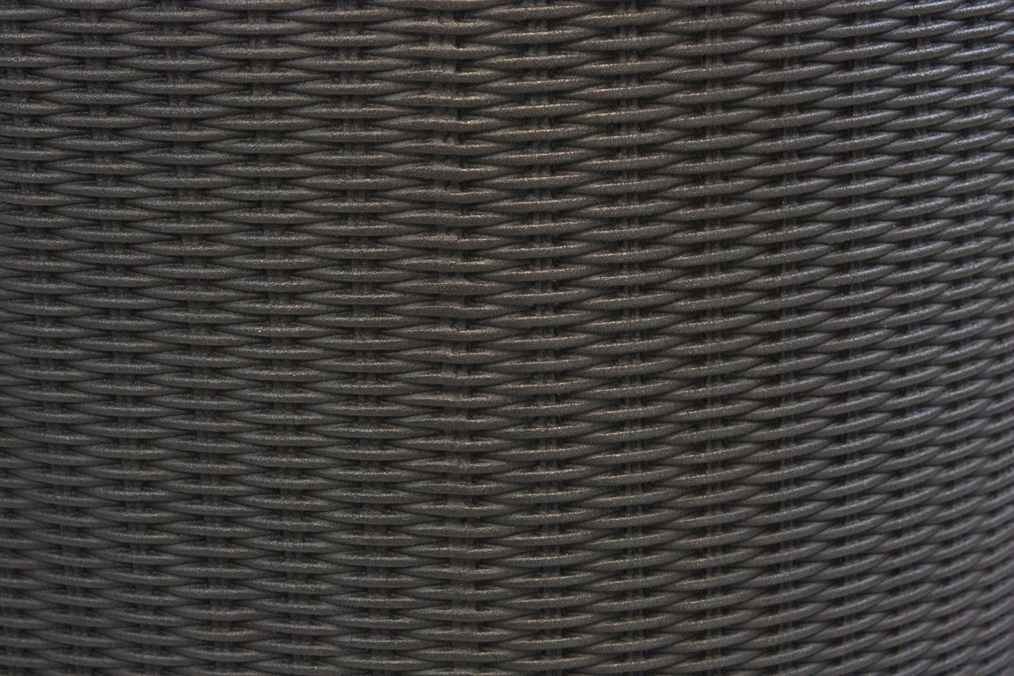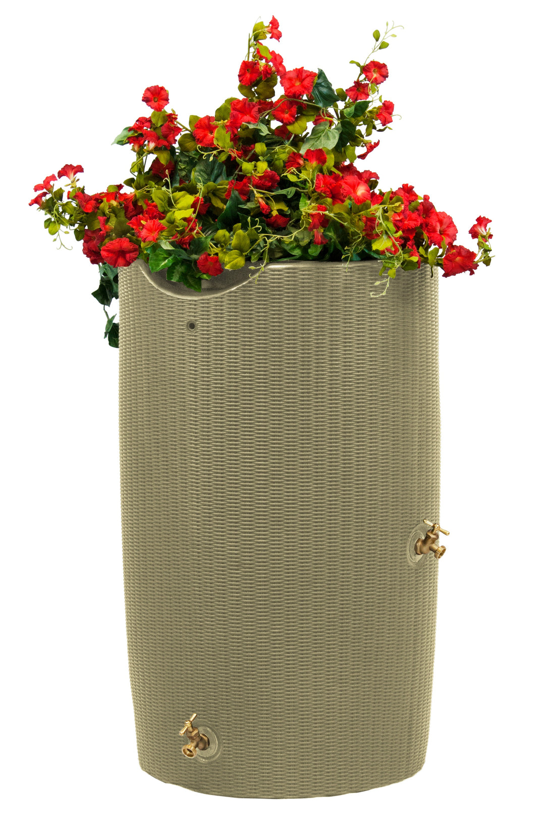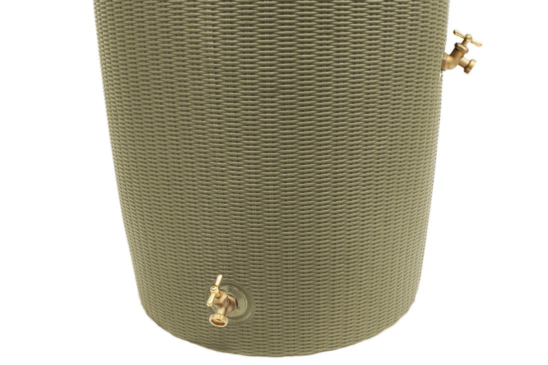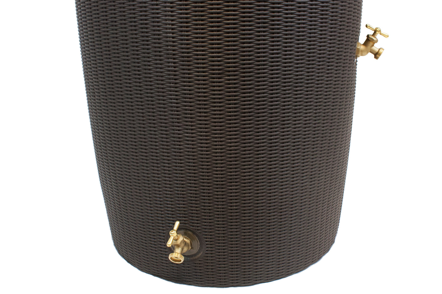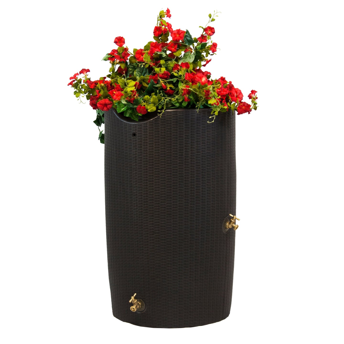 The Impressions Bali 50 Gallon Rain Saver is perfect for virtually any home. Its appearance emulates the rotund woven texture of a wicker storage bin, and with a deep welled top, you can plant an array of flowers or even a small herb or vegetable garden. The top also includes the Good Ideas original, integrated channel that automatically diverts overflow to the front of the barrel and keeps your foundation from flooding. The large opening which can be used for 2x3 or 3x4 downspouts is covered with a soft, fine mesh, plastic screen that keeps out heavy debris. Also included with the barrel are two sturdy brass spigots to install in the offset spigot locations.