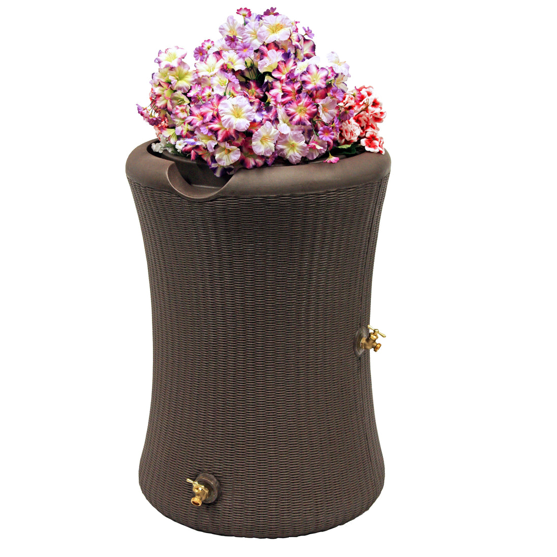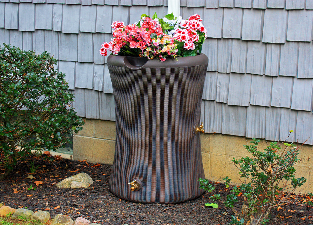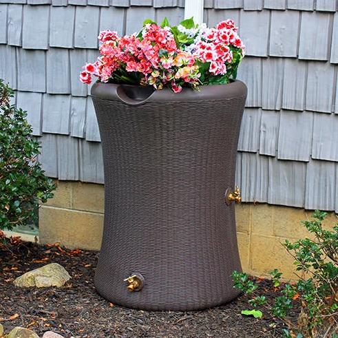 The 65-gallon Willow Rain Saver is a sturdy and eye-catching rain barrel whose wicker design will never unravel or fray. With a welled top, you can plant an array of flowers or even a small herb or vegetable garden. The top also includes the Good Ideas original, integrated channel that automatically diverts overflow to the front of the barrel and keeps your foundation from flooding. The large opening can be used for 2x3 or 3x4 downspouts and is covered with a soft, fine mesh, plastic screen that keeps out heavy debris. Also included with the barrel are two sturdy brass spigots to install in the offset spigot locations.