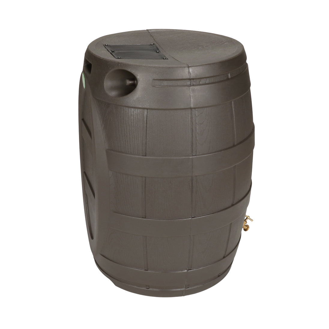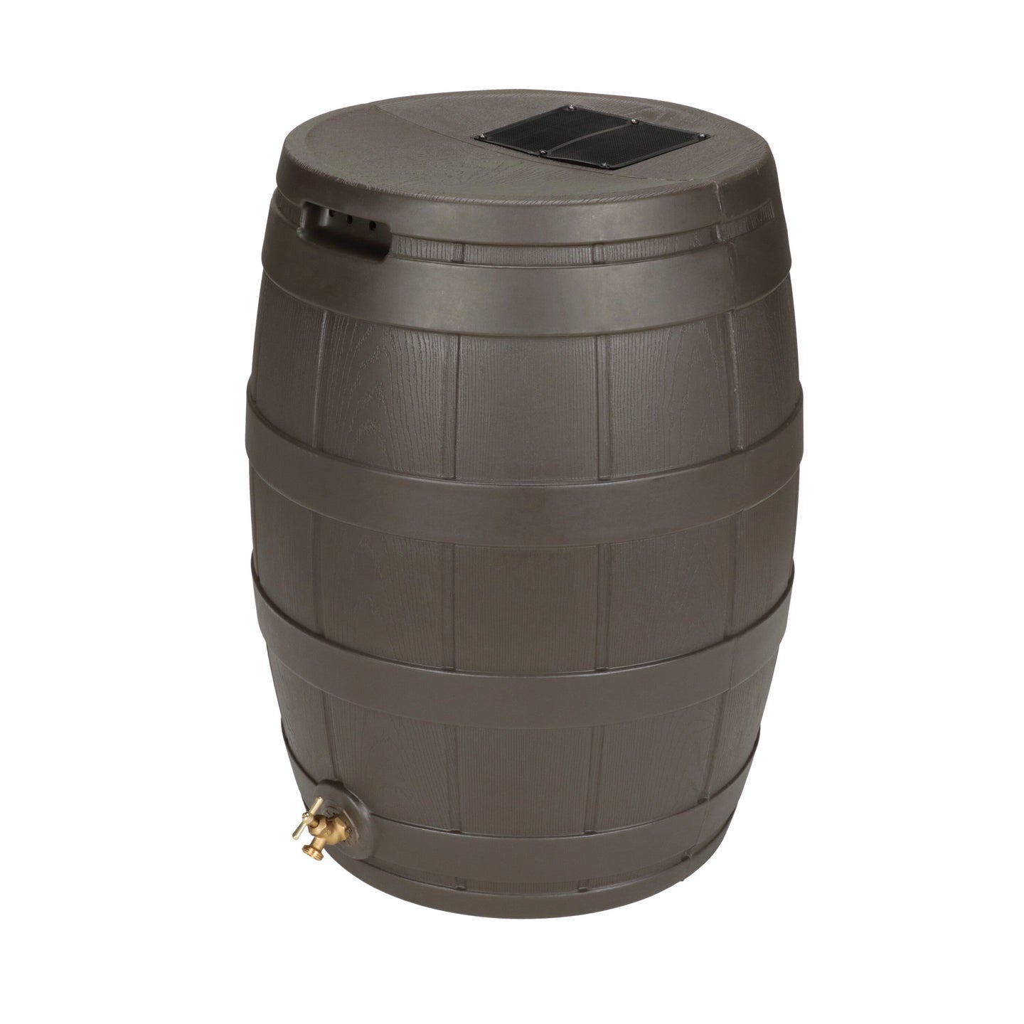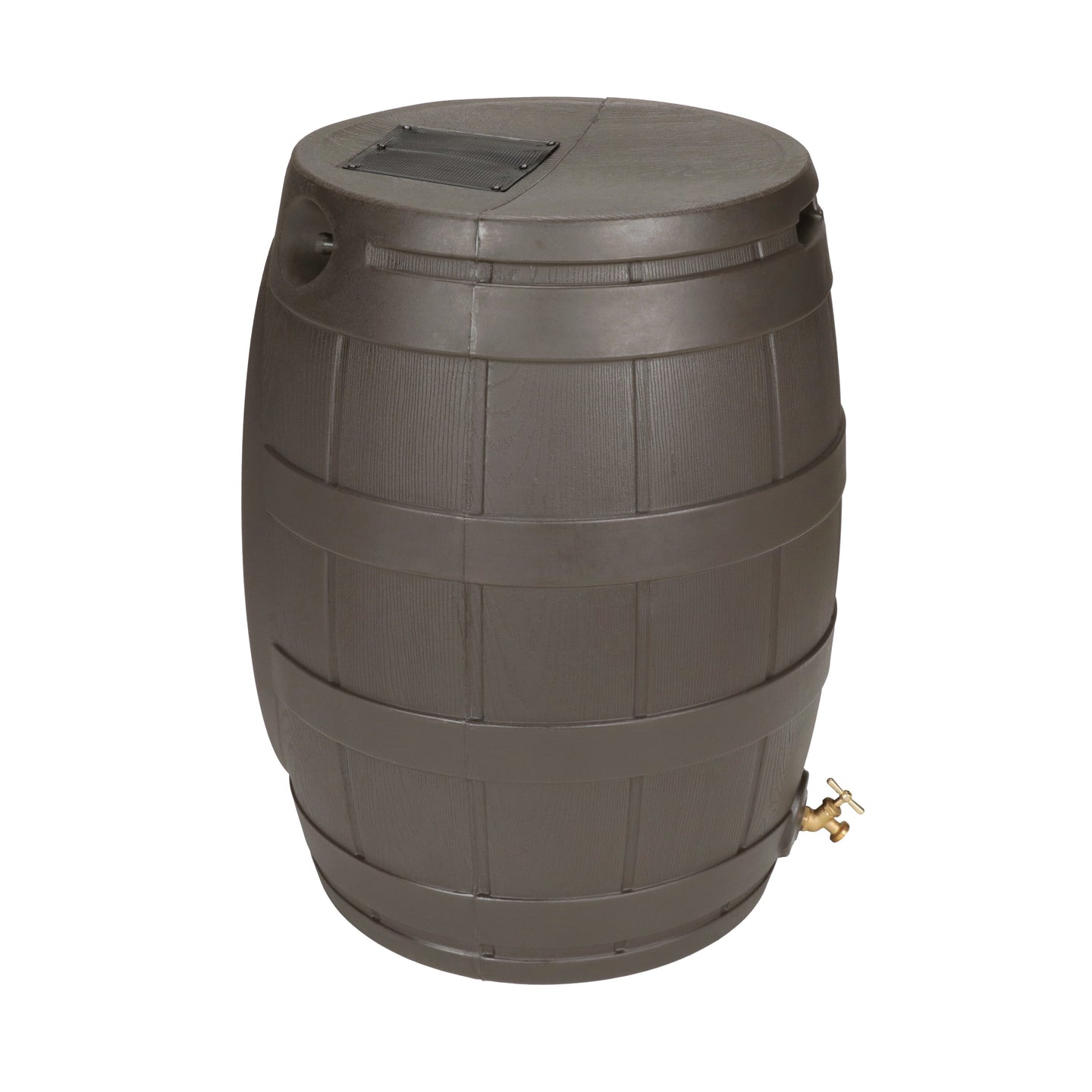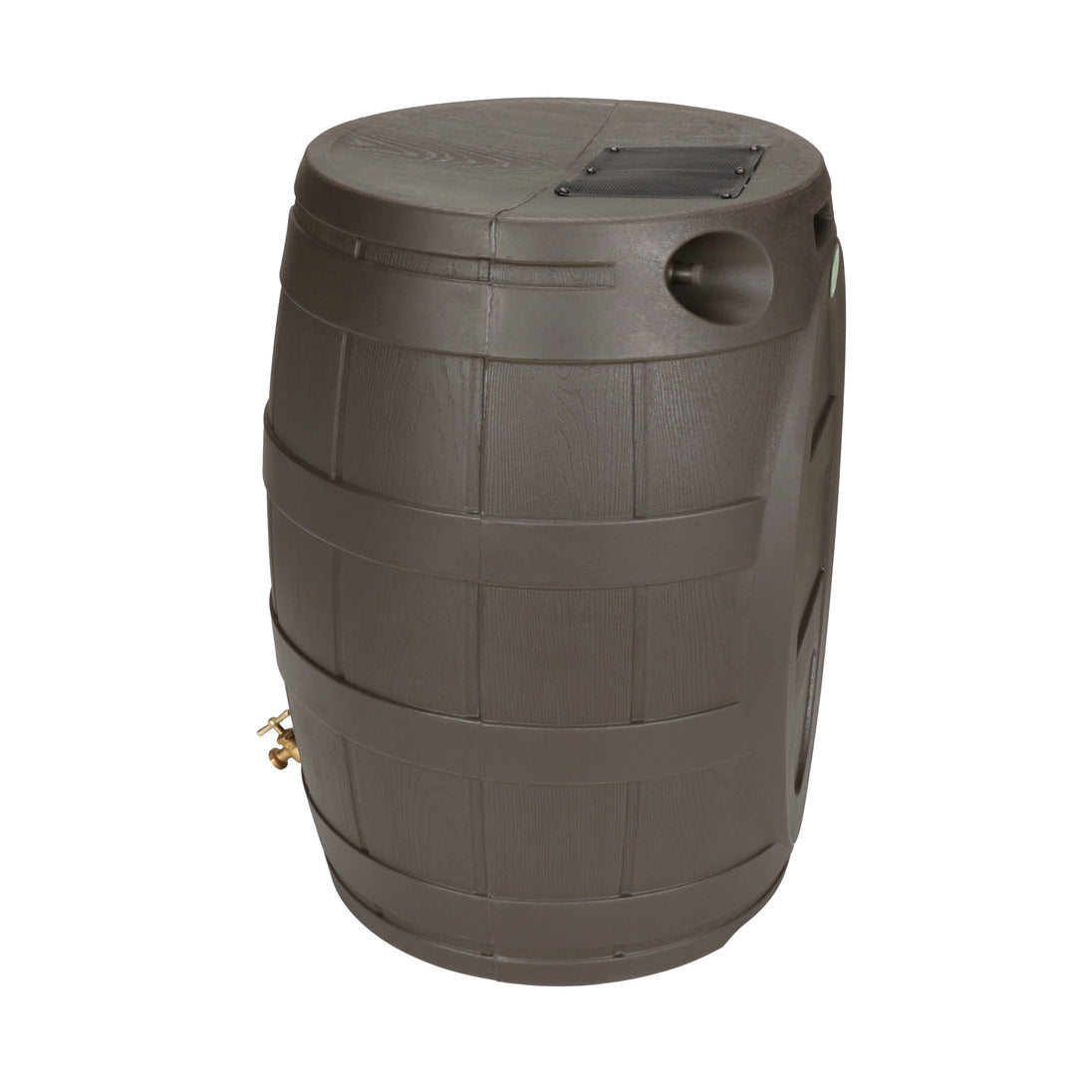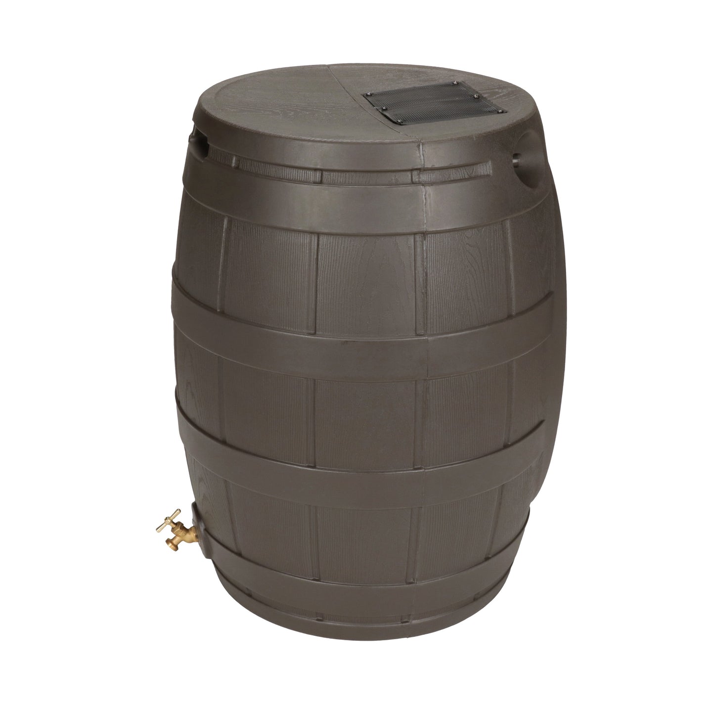The Rain Vault 50-gallon rain barrel is a classic looking barrel. Modeled after an actual whiskey barrel, this unique rain catcher will provide you with plenty of fresh water while looking great against your home. The top features an anti-debris screen to keep out leaves, and the bottom hosts a high-quality brass spigot for a standard hose connection. The back is flat to sit flush against exterior walls so you don't lose space, and there are connection points which can be used to link barrels together, using the overflow to fill the next barrel. The barrel also has two, deep set handles which are very convenient when moving the Rain Vault.