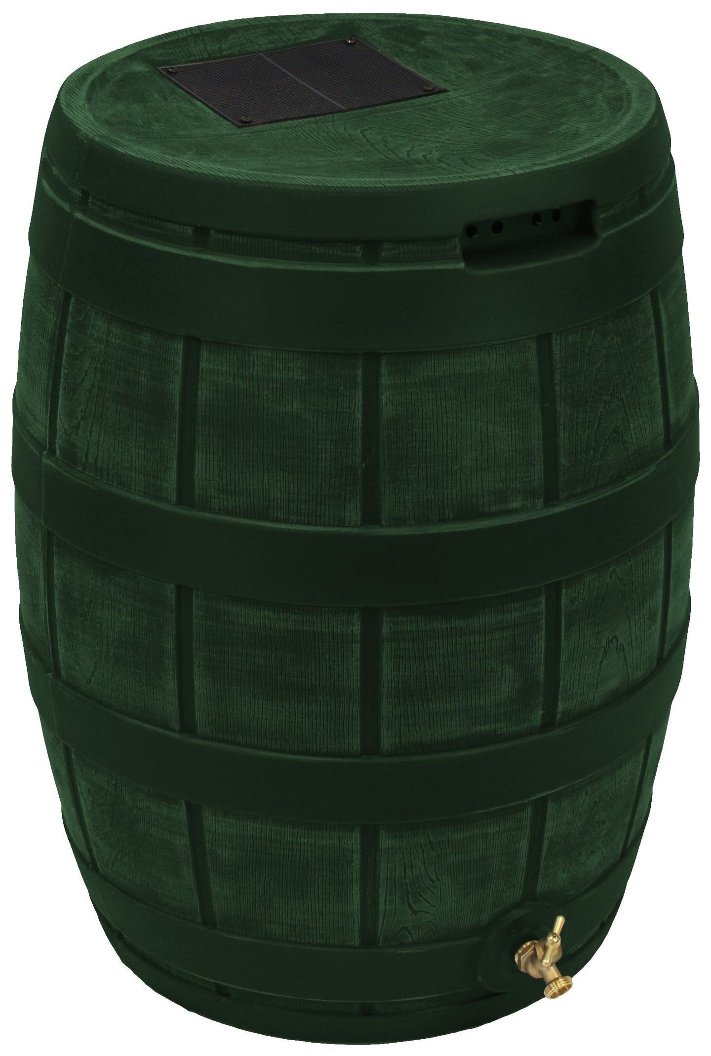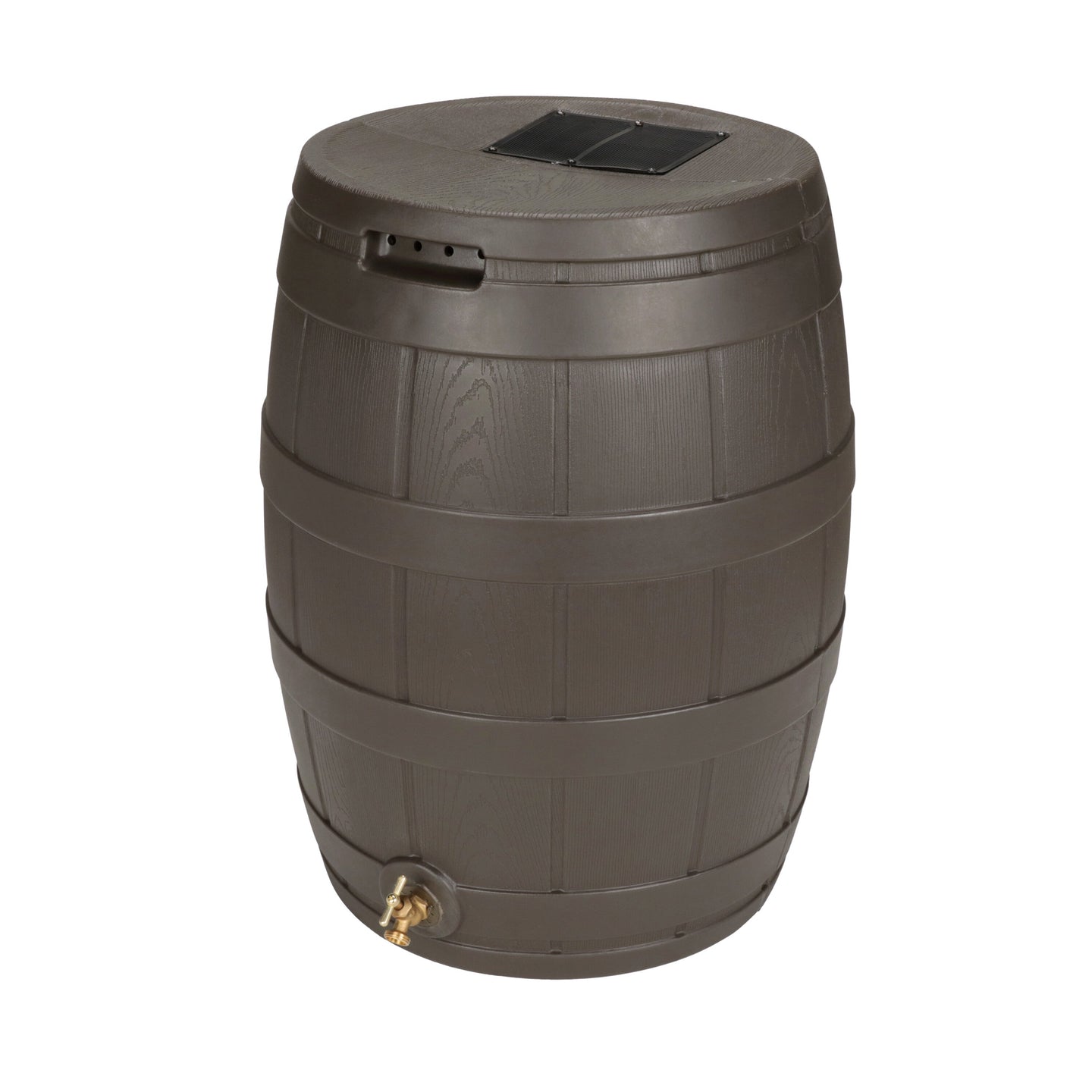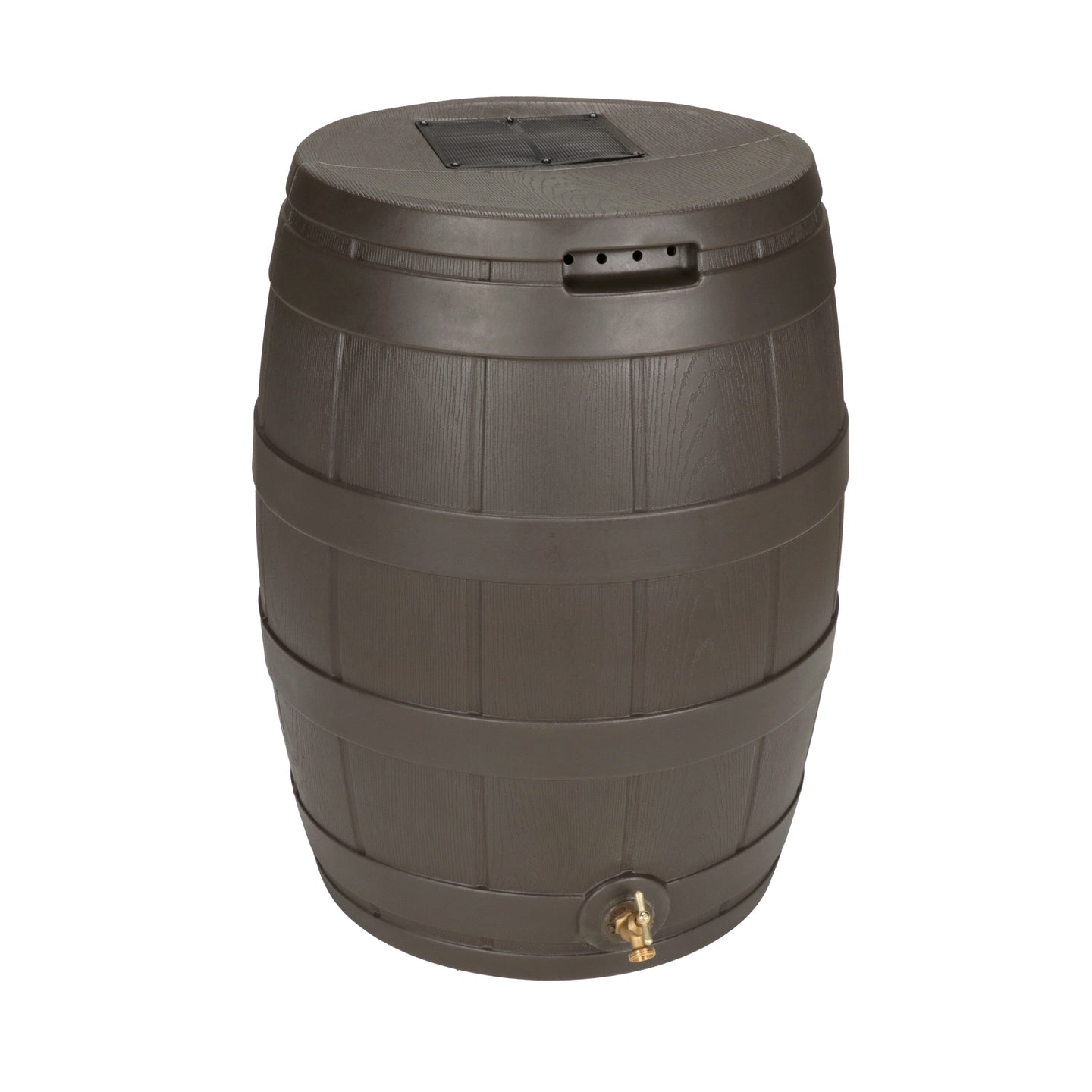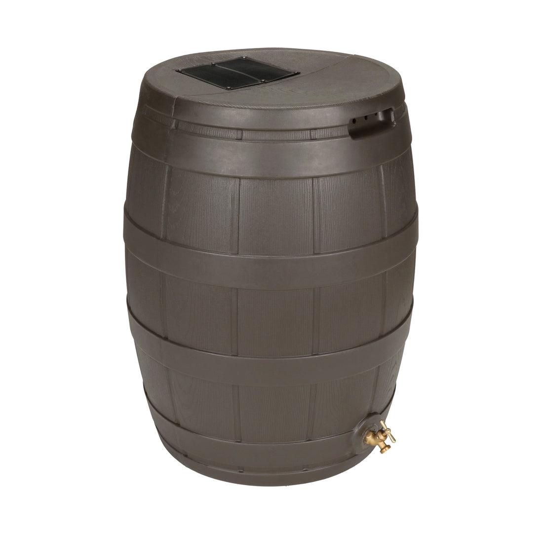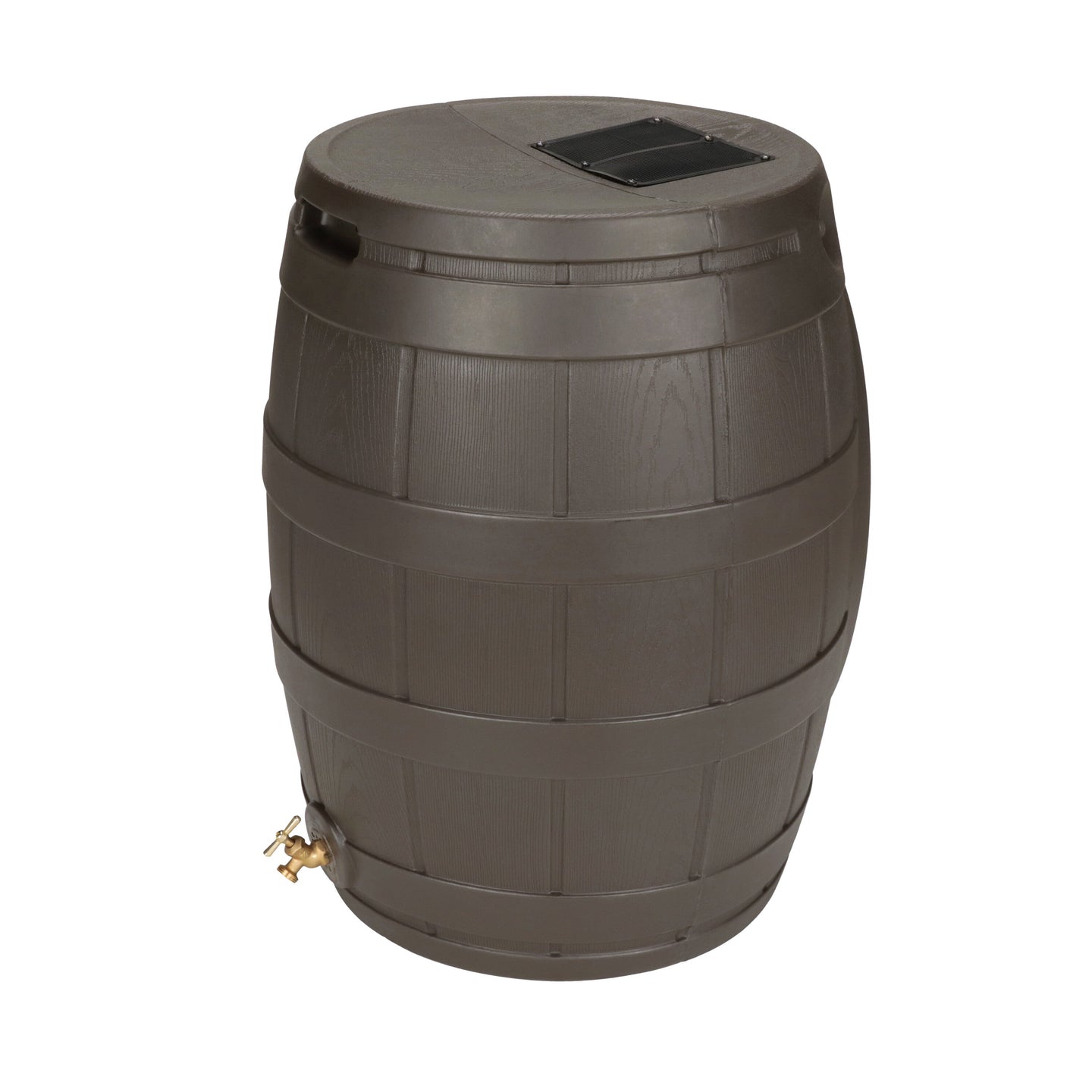 The Rain Vault 50-gallon rain barrel is a classic looking barrel. Modeled after an actual whiskey barrel, this unique rain catcher will provide you with plenty of fresh water while looking great against your home. The top features an anti-debris screen to keep out leaves, and the bottom hosts a high-quality brass spigot for a standard hose connection. The back is flat to sit flush against exterior walls so you don't lose space, and there are connection points which can be used to link barrels together, using the overflow to fill the next barrel. The barrel also has two, deep set handles which are very convenient when moving the Rain Vault.