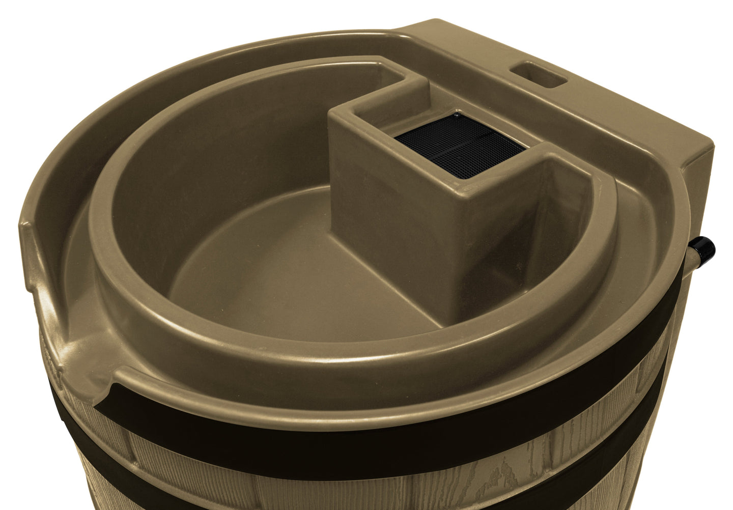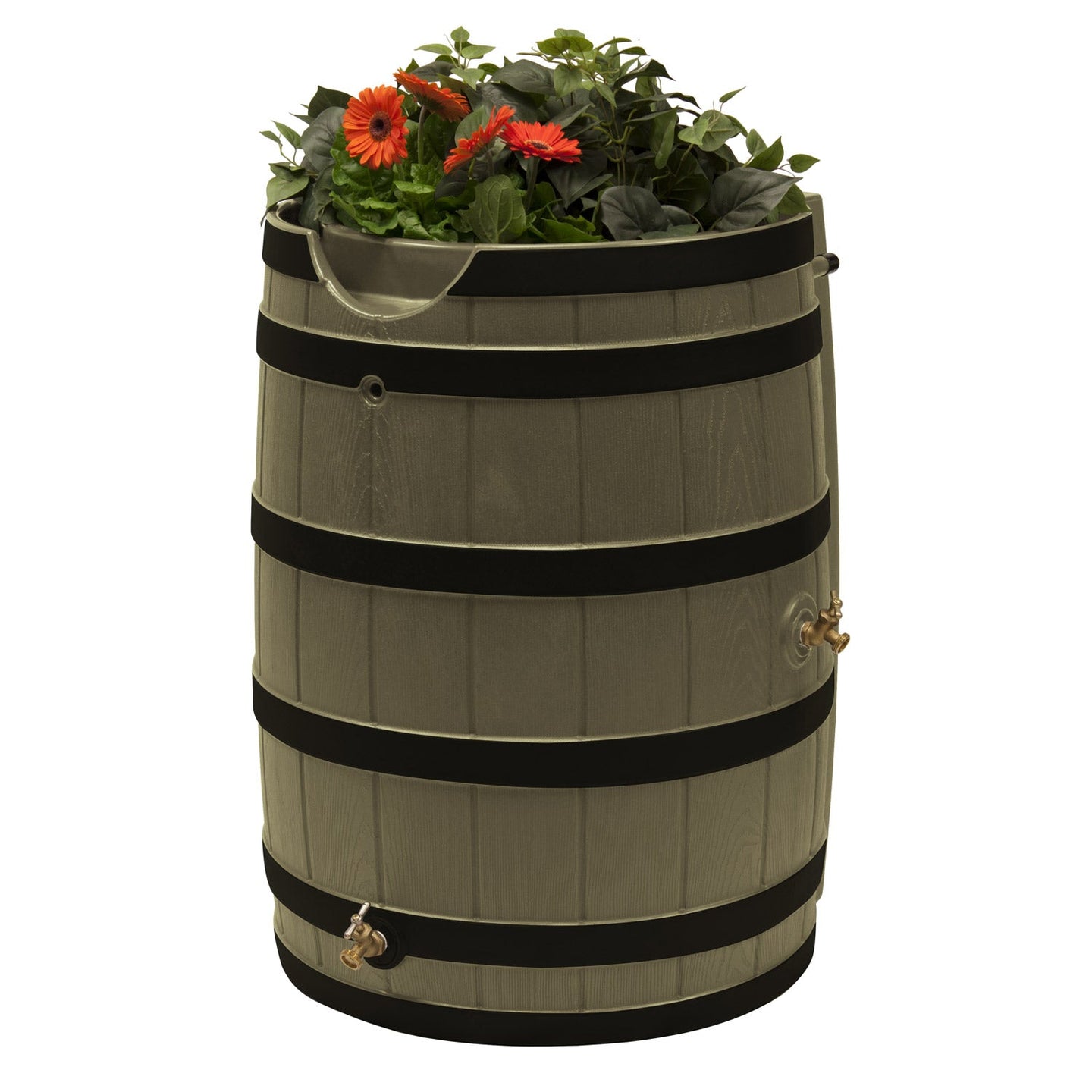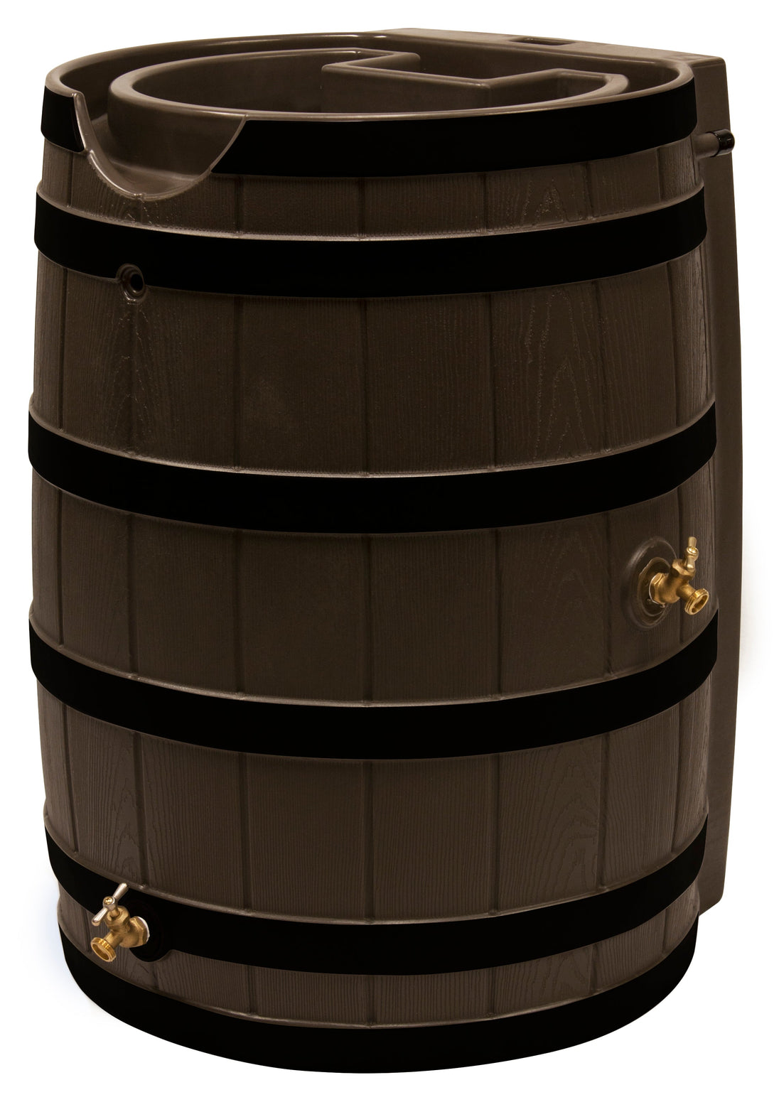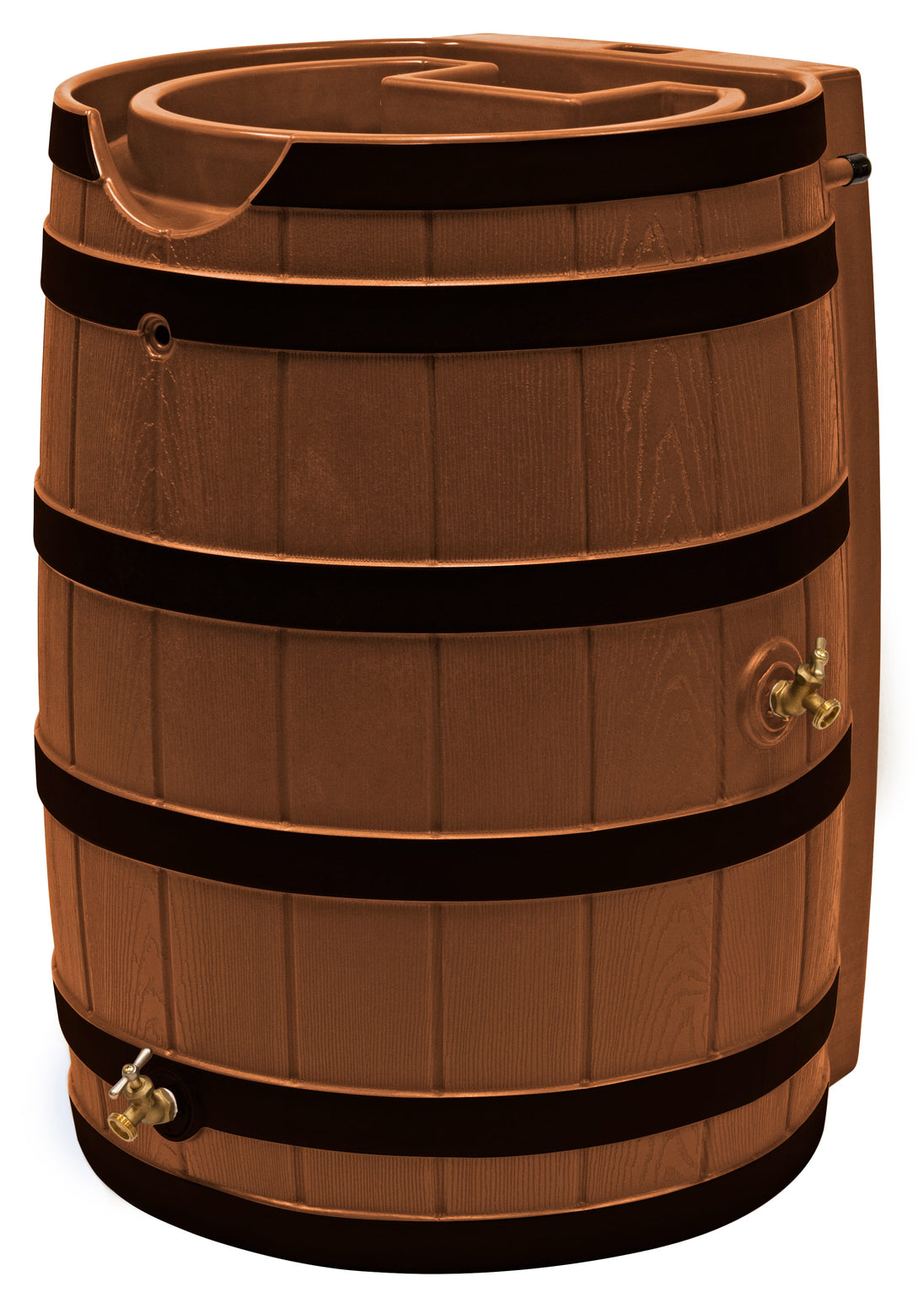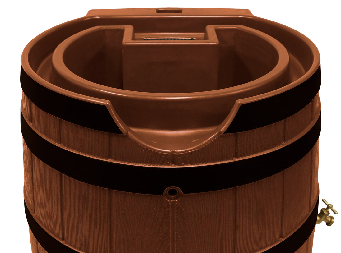 The Rain Wizard 65 with Darkened Ribs is a rustic, faux oak rain barrel with a distressed wood-grain texture that’s highly detailed and a one cubic foot, self-draining planter top. It holds 65 gallons and has a fine mesh screen to keep out debris along with front-facing overflow. This barrel features connection points for linking to other rain barrels and a flat-back that can sit right up against exterior walls. Two standard 3/4” brass spigots are included. Incredibly strong, this rain barrel can take heavy impacts and holds up against the weather thanks to its sturdy, BPA-free plastic construction. Made in the USA.