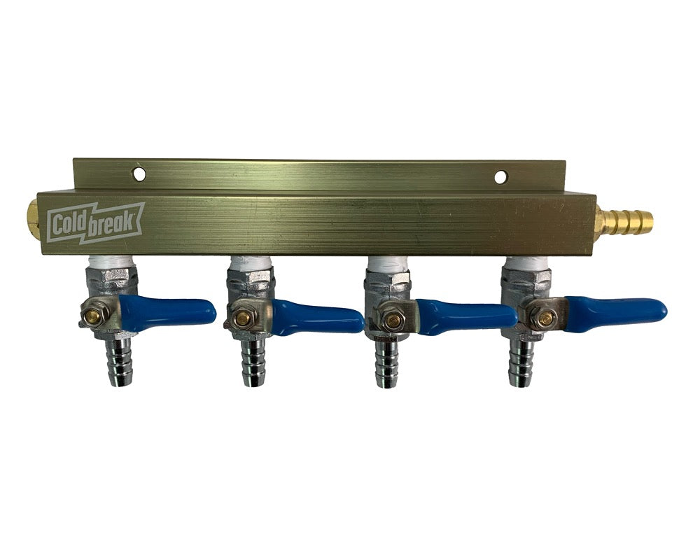 Effortlessly distribute CO2 to multiple kegs with the Coldbreak 4-Way Gas Manifold. Designed for homebrewers and professionals alike, this heavy-duty aluminum manifold ensures a steady, reliable flow of gas to your kegs. Each port is equipped with integrated check valves to prevent backflow, safeguarding your regulator and system.